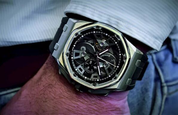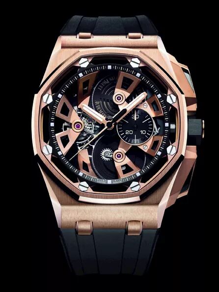 懷舊之餘,同時亦有創新設計的陀飛輪,將之前的Royal Oak Offshore陀飛輪計時表重新設計,表盤更加open,整個手上鍊機芯面貌完全一覽無遺。所有搭橋都換了新造型,令層次感更加豐富,是專為這次25周年特別版而製造的。配搭不同物料一向是Royal Oak Offshore的特色,這次也不例外,計時按鈕和表冠不再是金屬和橡膠,而是轉用陶瓷。直徑45mm的表殼有不鏽鋼和粉紅金兩種選擇。(Connie)