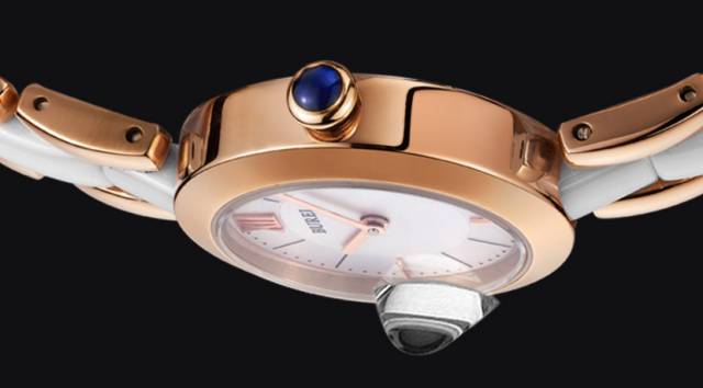 典雅的表盘厚度仅有8mm,人工合成的蓝宝石表镜无镀膜,不易磨损。精湛的30M防水设计,滴水不进。