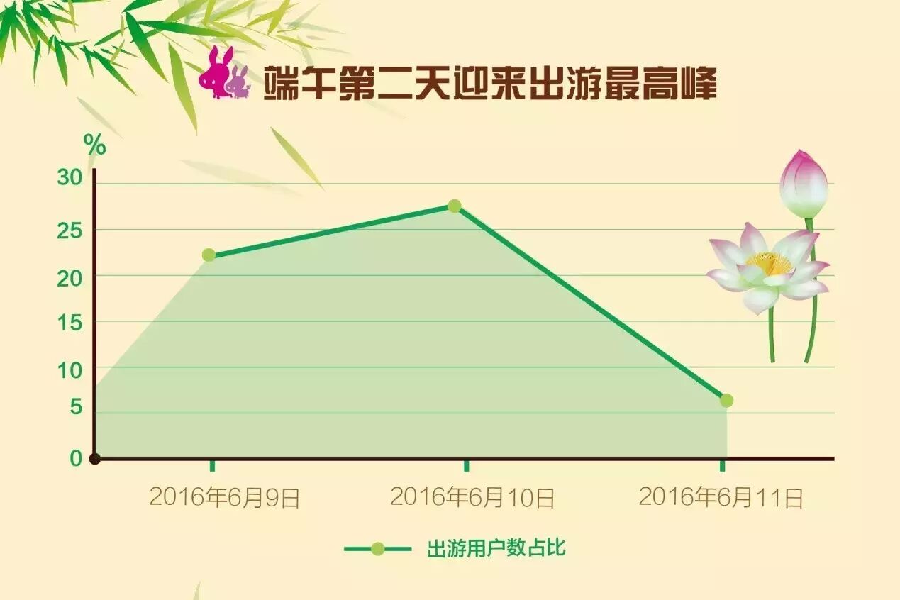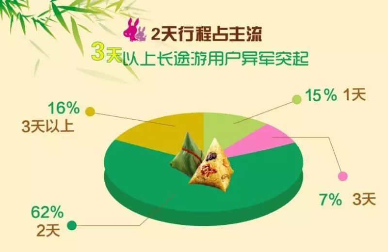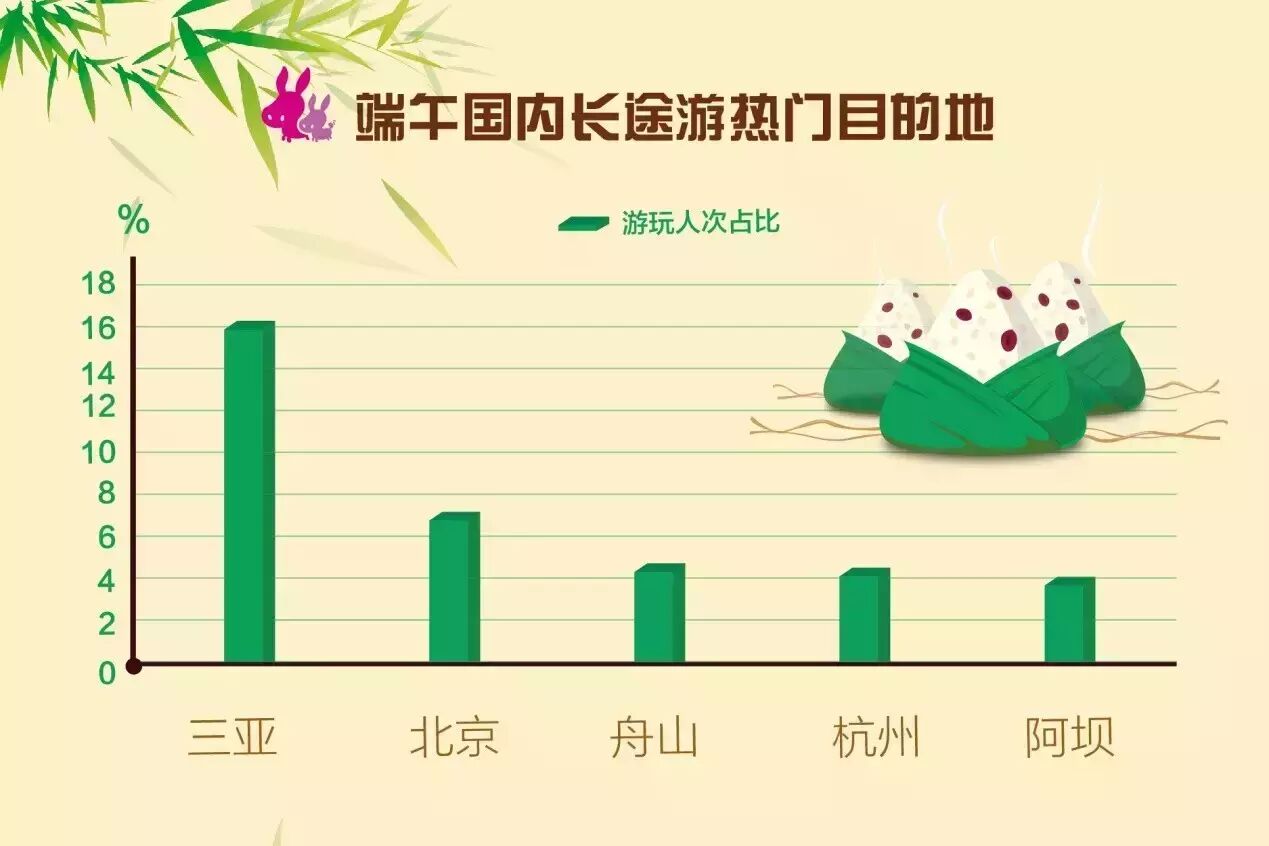驴妈妈大数据显示:80%用户选择周边游,2天行程的短途游是主流,孩子们喜欢的主题乐园、动物园类景区持续爆棚,一些古镇也出现了人山人海的景象。广东、江苏、浙江周边游人气最旺,端午期间拼假长途游成为另一大亮点,国内的三亚、北京、舟山、杭州人气高,境外的日本、韩国、泰国、香港等是热门目的地,邮轮旅行成新宠。