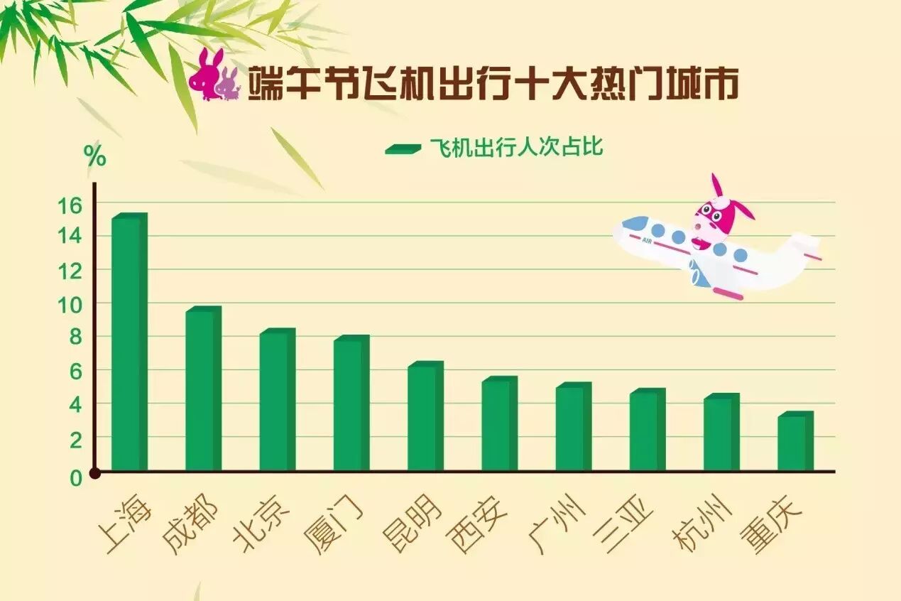 飞机作为目前最快速的交通工具之一,有效缩短了游客在路途上奔波的时间。驴妈妈端午假期统计数据显示,上海、成都、厦门等城市的游客,对于乘飞机出游的需求较为强烈,同时,这些城市也是乘飞机出游的热门目的地城市。飞机出发城市Top 5分别为:上海、成都、厦门、北京、昆明,落地机场城市排名Top 5则为:上海、成都、北京、厦门、南京。此外,随着高铁不断完善,高铁游也被更多游客接受。高铁出发热门站点TOP 10 分别为上海虹桥、北京、北京西、上海、杭州东、北京南、南京、南京南、天津、重庆北。