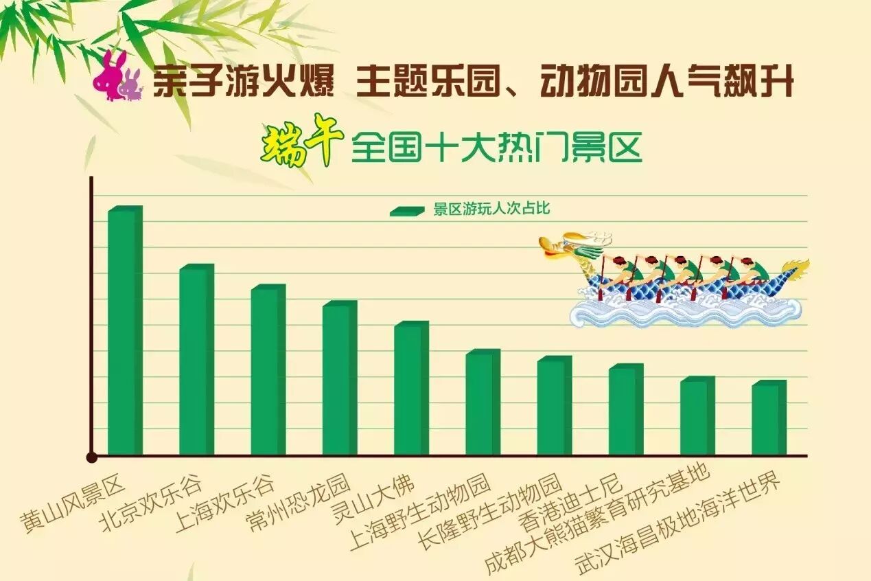 端午小长假全国大部分地区天气晴好,儿童出游需求量的增加带热了一大批主题乐园:如华东地区的上海欢乐谷、上海野生动物园,华南地区的长隆野生动物园,西南地区的成都大熊猫繁育研究基地,华中地区的武汉欢乐谷等,在端午期间都陆续接待了大量的游客。苏州金鸡湖、沙家浜、无锡蠡园等景区举办了别具特色的时令节气活动---龙舟赛,也吸引了不少游客。