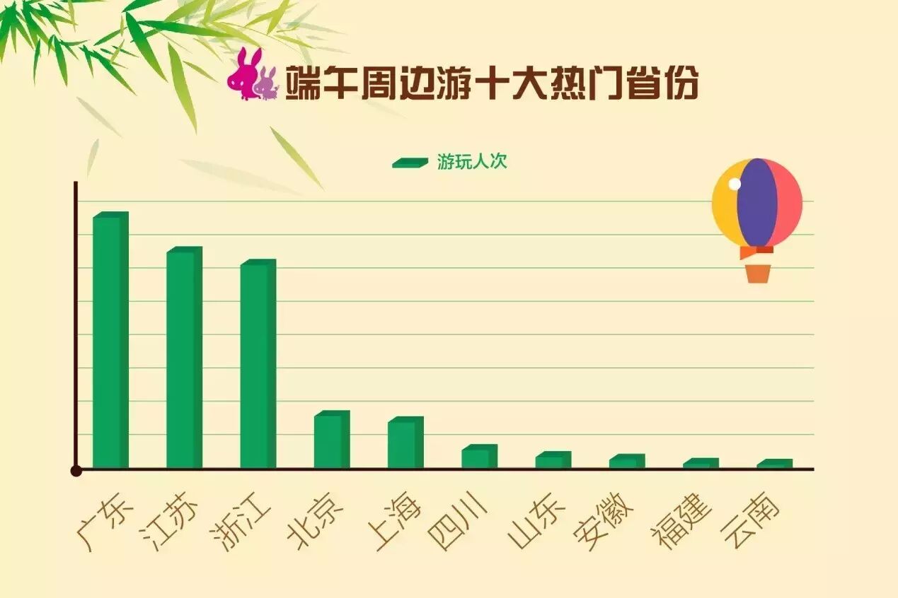 端午节不仅是中国传统节日,也是上半年最后一个国家法定节假日,除了遵循传统民俗吃粽子、赏龙舟外,也有许多游客趁着假期外出旅游放松心情。然而,由于假期不长,3天以内行程的周边游依然是大部分游客出行的首要选择。数据显示,驴妈妈周边游的人次量是去年同期4.14倍;作为自驾游、亲子游大省,广东端午周边游最活跃。