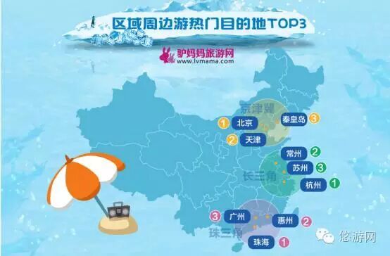 《报告》显示,今年暑期周边游出游人次是去年的3.1倍,北上广深依然是周边游主要客源地,占全国周边游客比超五成。其中,长三角居民最青睐的周边游目的地依次为:杭州、常州、苏州;京津冀居民最青睐的周边游目的地为:北京、天津、秦皇岛;珠三角居民最青睐的周边游目的地为:珠海、惠州、广州。