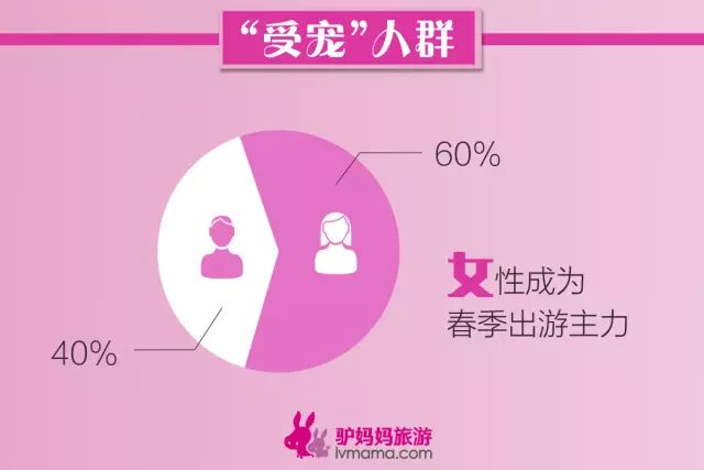 此次驴妈妈320粉红旅游节打出的口号是“让春天宠爱你”,首日数据显示,春风十里,女性更加宠爱自己,全网下单用户男女比例中,女性用户占比60%,成为春季出游的主力。