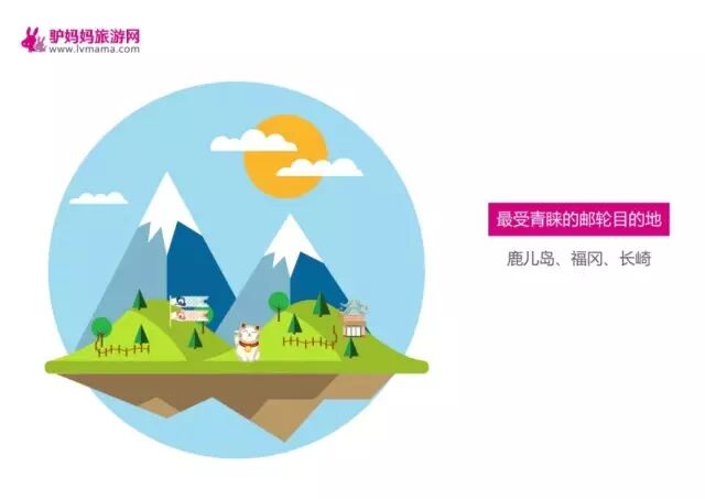 众多邮轮线路中,83%以上的中国游客出海偏向选择日韩航线,其次为港澳台、东南亚(越南)航线等。2015年日本港口大放异彩,加上日本对邮轮新实施的的免签政策,赴日邮轮产品呈现出空前的高丰富度。《报告》显示,最受游客青睐的邮轮目的地为鹿儿岛、福冈和长崎。