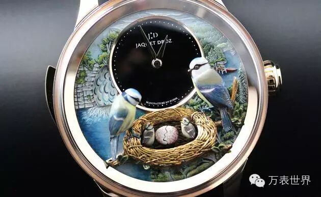雅克德罗用了两年的时间研制这块表,所有的制作都是自主完成的。表的左侧设置了三问报时按钮,当腕表的三问功能启动时,神奇的现象就发生了。只需拉下拉杆,便可听到时、刻和分的报时铃声,并启动相应的活动场景,表盘上面的背景活灵活现,瀑布仿佛流动了起来;蛋壳裂开,蹦出一只雏鸟,母鸟开始给它喂食。