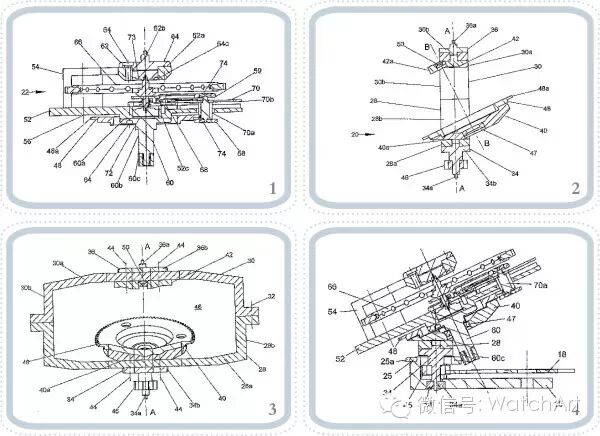 其次,图2与图3所示为外轴陀飞轮,图2是外轴陀飞轮的基本构造,A-A轴与B-B轴相互交叉形成一个角度,而内轴陀飞轮是以B-B轴为轴心线旋转,A-A轴是外轴陀飞轮的轴心线。图3是外轴陀飞轮框架的立体效果图,此外轴陀飞轮机构包括:上支承夹板30、上支架42、上支承宝石50、上支架轴36、上支架轴尖36a、下支承夹板28、下支架40、下支架轴34、下支架轴尖34a、下支承宝石47、外秒齿轴45、秒轮片48、秒轮片齿48a,其特点是分成了上下两层,其中上支承宝石50与下支承宝石47作为内轴陀飞轮的上下支承,而我们曾经讲过的宝玑式陀飞轮被固定在夹板上的秒轮片48在这里被固定在外轴陀飞轮的下支架40上,进而将它们同时固定在下支承夹板28上,外秒齿轴45将会与输入能量的轮系连接,上支架轴尖36a与下支架轴尖34a的作用相当于宝玑式陀飞轮的两个支承轴一样,它们支撑起整个双轴陀飞轮的框架,而且每个支承轴尖被设置于固定在夹板上的上下两个支承架的宝石轴承内,此时需要注意是刚才说到的上下两个支承架是固定不动的;