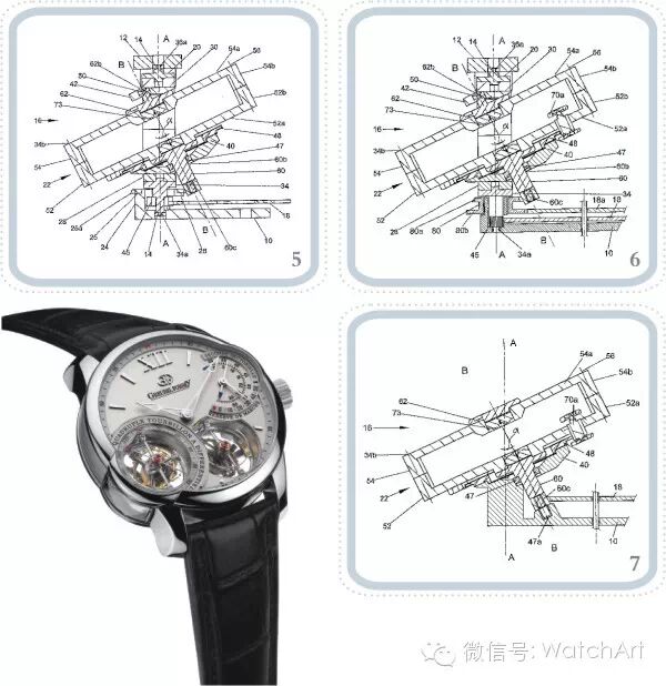 下面介绍一下Greubel Forsey双轴陀飞轮的工作原理:其实,前面说过双轴陀飞轮就是两个陀飞轮框架被整合串联为一个整体框架,(见图4、图5)首先是能量输入轮系18将动力传递给了外秒齿轴45,由于此秒齿轴紧固于外轴陀飞轮框架的下支架轴34,因此它带动了外轴陀飞轮开始转动,与此同时外轴陀飞轮也开始驱动内轴陀飞轮的内秒齿轴60c与外轴秒轮片25啮合,并且以A-A轴心线为轴公转的同时还以B-B轴心线为轴自转,此时秒轮片48在外轴陀飞轮框架的带动下以A-A轴心线为轴公转的同时与擒纵齿轴70a保持着啮合的关系,而擒纵齿轴70a既与秒轮片48公转啮合,又与擒纵机构配合中自转,这样从外轴框架输入的能量通过这几个环节逐层输入到了调速机构,使摆轮游丝系统得到了动力后开始运转起来,也就是说双轴陀飞轮开始工作了。这时,双轴陀飞轮的转动速度是以内外两个轴来计算的,内轴陀飞轮是每分钟旋转一周,而外轴陀飞轮是以每4分钟旋转一周,这两个轴的旋转速度是根据设计者的齿轮的配比来完成的,也是根据机心整体的需要来设定的,最关键的传动比在于内轴陀飞轮的擒纵齿轴70a与外轴陀飞轮的秒轮片48a的齿数比以及内轴陀飞轮的秒齿轴60c与外轴陀飞轮的秒轮片25的齿数比,此外跟外轴陀飞轮连接的输入能量的轮系被它控制了转动速度,从而控制了与之连接的显示轮系来显示时间,这样完整的陀飞轮机心轮廓已经完成。