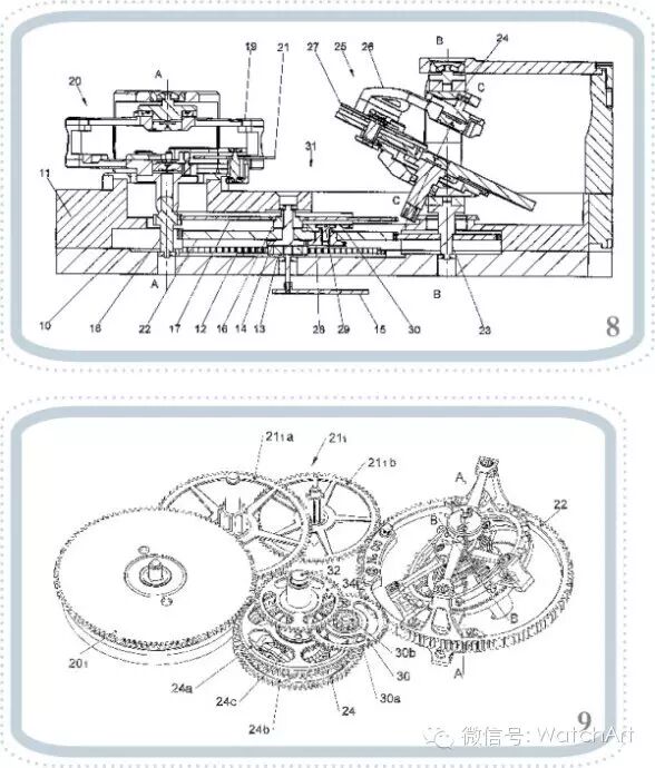 WO专利公开号2005043257A1为Greubel Forsey差动式双体陀飞轮机械表申请的发明专利,它就是基于上面说到的设计思路将两个双轴陀飞轮通过一套差动轮系的并联连接形成了一个完整的机械表机心,如图8所示,此机心包括了:①陀飞轮20与陀飞轮25,这两个陀飞轮可以是前面已经讲过的双轴陀飞轮,也可以是我在2010年给大家所介绍过的任意种类陀飞轮的组合,陀飞轮20的能量输入端是18,陀飞轮25的能量输入端是23;②差动轮系是通过齿轮13、齿轴14、行星齿轴28、行星齿轮30、行星螺钉29、第一轮片22、第二轮片17、齿轴16组成;③能量输入轮系12,其中第一轮片22与第二轮片17的齿数相等,齿轴14、行星齿轴28、行星齿轮30与齿轴16四个齿轮的齿数比决定了此行星轮系的均化倍数,齿轮13与能量输入轮系12相互啮合,齿轴14与行星齿轴28相互啮合,齿轴16与行星齿轮30相互啮合,第一轮片22与陀飞轮25的能量输入端是23相互啮合,第二轮片17与陀飞轮20的能量输入端是18相互啮合。
