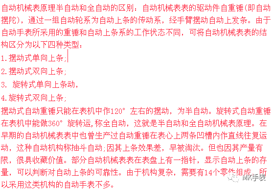 六. 上条系:上条系的作用是给原动系输送能量的机构,它分为手上链和自动上链两种,其中带有自动上链的机芯也是同时可以手上链的只是其结构更加复杂,并且自动上链机芯还可以细分为单向上链和双向上链两种,所谓的单双向指的是负责提供旋转力矩的自动锤组件在顺时针或逆时针方向中单方向可以驱动上链机构还是双方向。