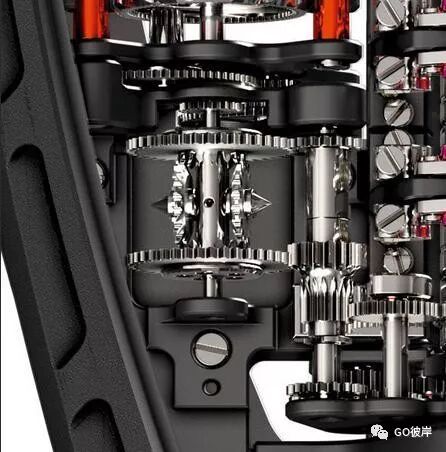 机芯运转创造出独一无二的显示效果。首先是在前端垂直面上小巧的秒显示,它们由固定在悬挂式陀飞轮框架上的铝柱进行指示(陀飞轮框架直径14.55毫米,大于通常的尺寸,使得机械部分的观赏性更为出色)。
