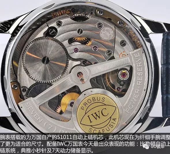 腕表搭载的为万国自产的51011自动上链机芯,此机芯现在为纤细手腕调整了更为适合的尺寸。配备IWC万国表今天最出众表现的功能:比勒顿自动上链系统,典雅小秒针及7天动力储备显示。