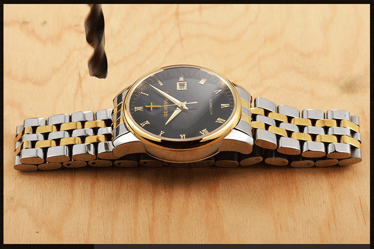 进口蓝宝石手表镜面,严格按照国际标准测试,防刮耐磨,是钢化玻璃硬度的几十倍,可抵挡电钻冲击,桌面都钻透了!佩戴者,100个放心,舒心,买的值!