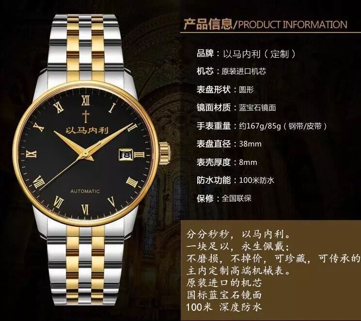 弟兄们,主内平安;全新,第3次的主内手表报名定制,开始了!还是高端机械表,不同的是:本批定制,只用原装进口机芯(成本约300元/块),只用国际蓝宝石表面(成本约200元/块),真实100米深度防水(专业测试)。主内定制价格:599元/块。仅接受付款预订。刨去表芯、表面的硬件必须成本,合作厂家,只赚了点人工费用,这是我们与厂家达成的协议,必须低价!也算帮他们推广,咱戴着质量好,弟兄们肯定会推荐给亲朋好友,只不过非主内定制,价格要高一点。首次定制名额仅100,以后是否还有定制,看厂家意见。(家人须知:首批定制,厂家往往最上心,建议有需要的弟兄,尽快联系,锁定名额)以马内利 高端定制