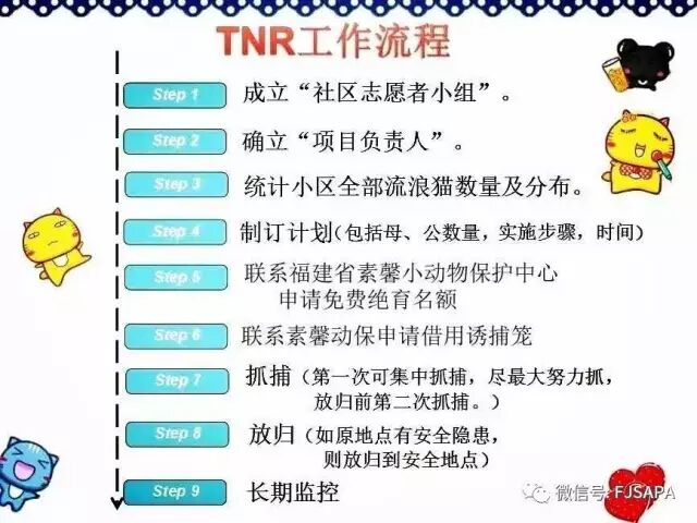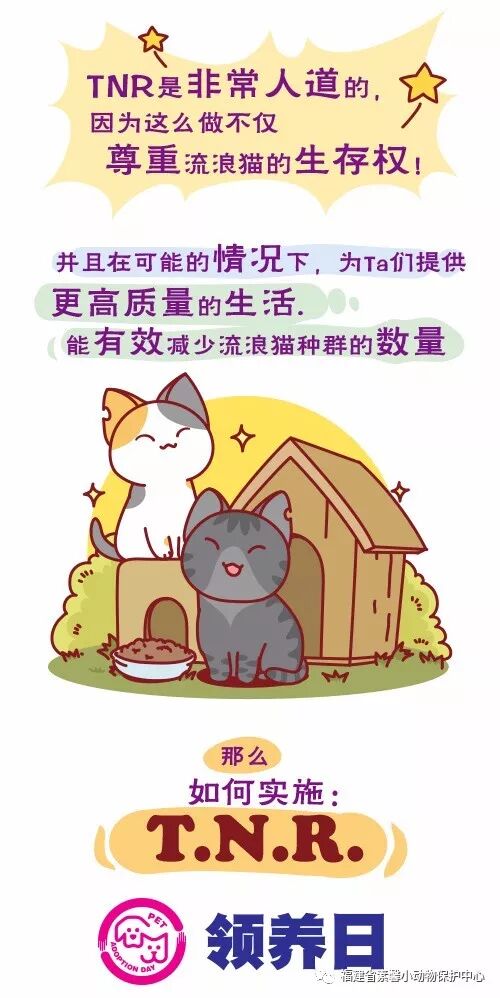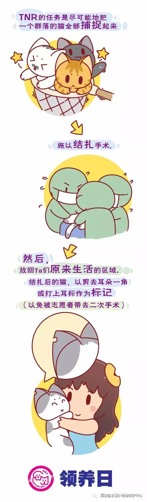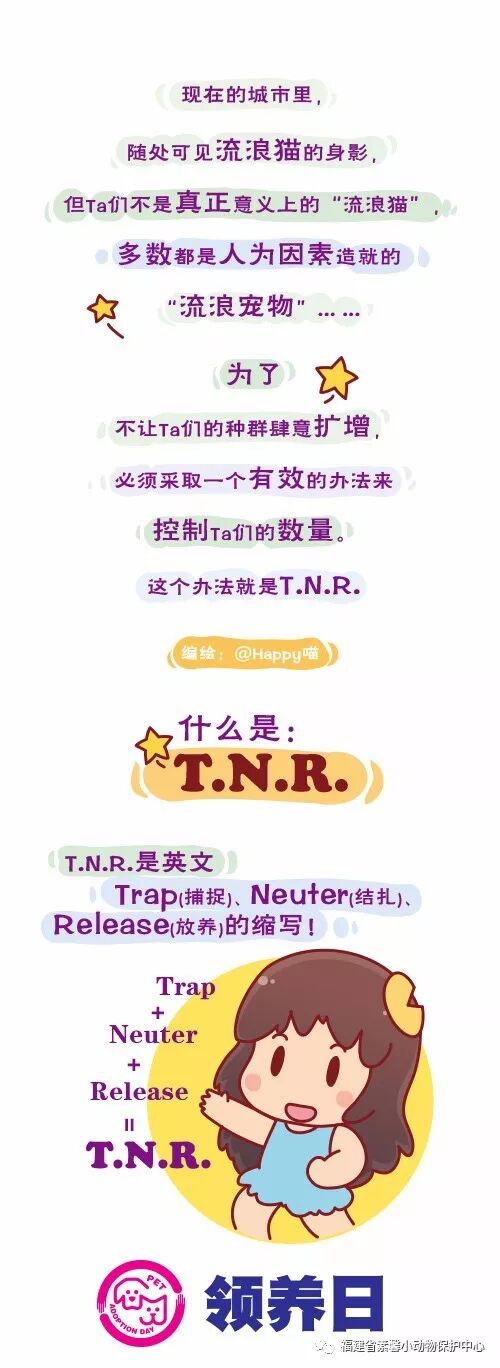 (Trap Neuter Release,简称TNR),是一种取代捕杀的人道管理和减少流浪犬和流浪猫数量的方法,TNR藉由施以绝育手术。TNR流程:绝育-剪耳-放回原处-群护。