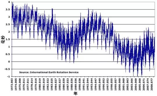 下图是近几十年不同年份的平太阳日的长度与86400秒的偏差图,来源于国际地球自转服务组织(IERS),从图中可以看出这个偏差的变化是复杂的不可预测的。![]()