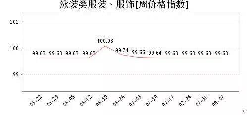泳装类服装•服饰本周价格指数为99.63点,走势平稳。高温持续,泳装行情持续良好。内销方面,女款产品中价格在40元左右的三件套碎花泳装短裙受到国内客商青睐;印花分体女士泳装、亮色系运动式女式泳装等热销西部沿海城市,以老客补货为主。外销方面,设计简单的比基尼泳衣较受欧美客商青睐;中东地区客商则较青睐于中低档女式分体泳装。