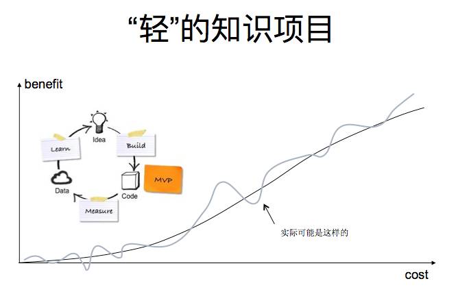 这里我给一个“重”的知识图谱项目的示意。下面有七步,叫斯坦福七步法,这是一个以前叫本体开发的方法。是一种比较经典的、瀑布式的开发方法。当然了,传统的本体工程里面也会说,这个并不是瀑布,是个迭代。但是这种方法首先会强调,还是要有一个类,先有类然后再有属性,再有实体,然后有实体上的各种约束。还是要一步一步走。它的假设说,我可以预先知道很多东西。但大多数情况下,我们根本不知道很多东西。我们甚至连用户的需求是什么都不知道:用户总是要一匹更快的马。所以你听他的肯定是错的。像这种方法,之所以在以前能够成功,因为它是政府的项目,通常几百万到几千万美元的,3年、5年、10年时间做完的项目,会有很多的大学啊,大公司啊,一起做。一开始光定下这个schema,可能需要一个工作组花一年时间来做。这样一种“重”的开发的方法,今天在web上面,在初创公司里面,这样是不行的,熬不过critical mass。我们要是这样做,就会死掉。