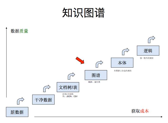 我们拿到干净的数据,不是一步就跳到知识图谱上面去的。很多时候,我们的应用场景并不需要我们做这么深度的挖掘发现。在结构化数据和非结构化数据之间我们会做一个平衡,有的时候进来的数据都是非结构化的,我们要对它进行一定程度上的结构化。至于这个结构化要做到什么程度,是由应用决定的。结构化的结果可能是JSON的,也可能是excel表格,也可能是其他的格式。这种不太完美的结构化就可以说是知识图谱了。再往后,我们通过实体的提取、关系的提取、实体的对齐、实体的消歧、实体的链接,把它变成一个图谱。再往上是本体、逻辑,各种不同的阶段,一步一步往上走,实现数据质量的提升。