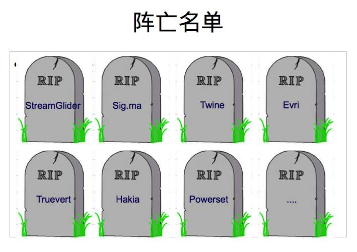 这是一些很不幸的前辈们,他们在没有办法控制成本的情况下,因为种种原因牺牲了。我们这里默哀一下。我们怎么能够避免他们的下场?上面的图最后这里有个点点点,可能现在大多数做知识图谱的公司在3年或5年之后也会到它们里面去。我们怎么能够让自己不进去呢?