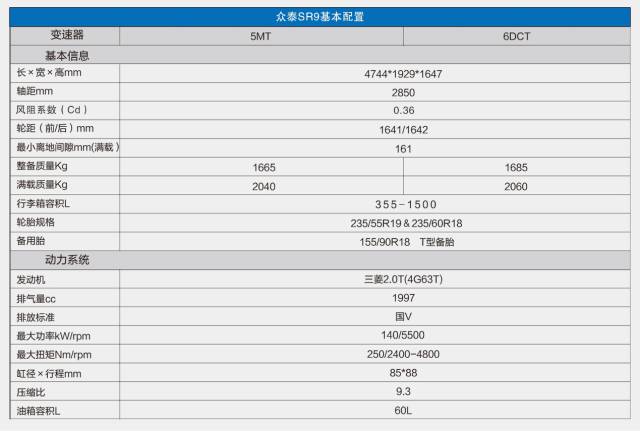“众泰SR9将搭载代号为4G63S4T的2.0T涡轮增压发动机,最大功率140kW(190PS),匹配5MT和6DCT变速箱,综合油耗分别为8.1L/100kM和8.4L/100kM……”