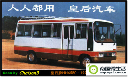皇后牌NN6580轻型客车,广西南宁汽车改装厂 1990年出品,采用NJ136、BJ130底盘,汽油、柴油两种动力,16~19座。1990年获广西区优质产品奖、中国汽车质量监督检验中心质量抽查一等品。