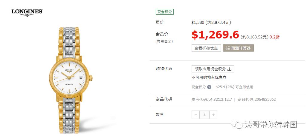 会员价(尊贵白金)$1,269.6 (约8,163.52元) 9.2折