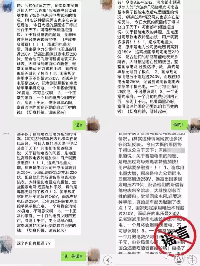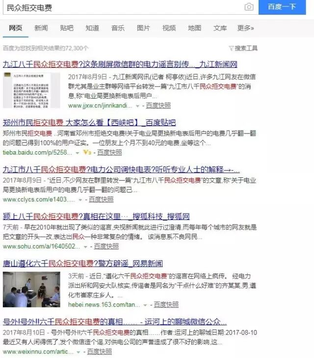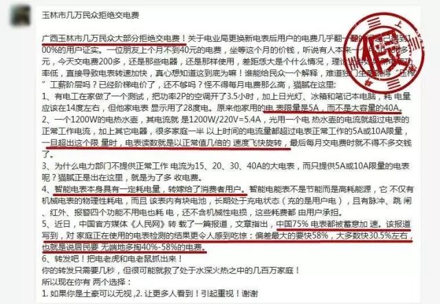 这些谣言越传越夸张!目前已经出现了广西玉林、江西九江、湖北洪湖、河北遵化等近10个地方版本,九成以上内容是一模一样的,所不同的只是“拒绝交电费”事件涉及的民众人数和事发地点。