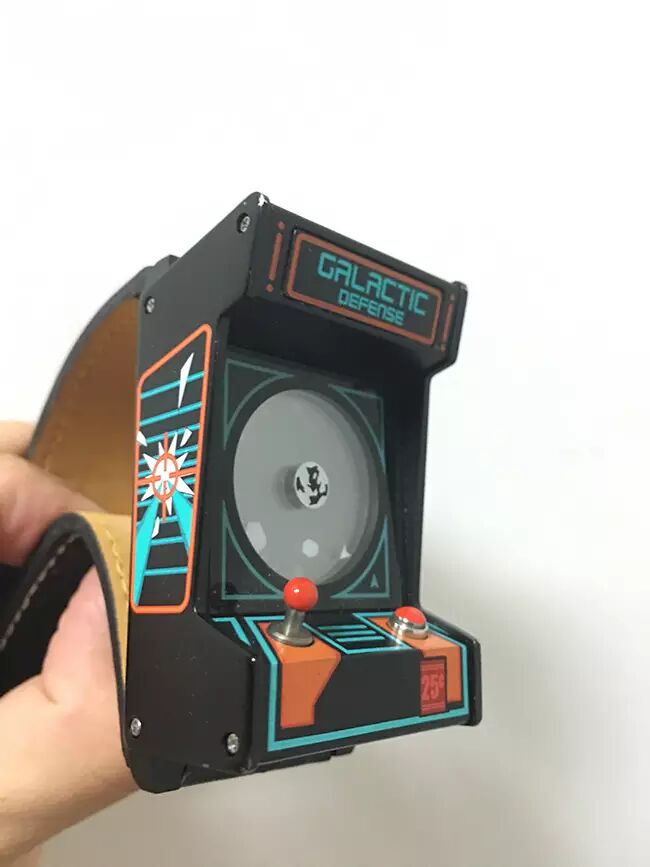 中间的地球估计是平行宇宙的熊猫故乡,所以一辈子没法照张彩照,大的陨石是分针,小的陨石是时针,显得很忙围着它们一分钟要巡航一次的小飞机是秒针,这款精致的机台腕表,来自于ThinkGeek(请用科学的上网方式造访他们官网),不但高度地还原了80年代街机造型,而且按动摇杆旁边的红色开火键,机台还会发出中二感爆表的 “biubiubiu” 音效。虽然那陨石一辈子也未必能撞上地球,而小飞机也只能通过绕晕陨石的方式进行防御,但是实在是有趣得很!换个角度来想,小飞机可能是邪恶的飞机星人, 而操纵陨石的则是正义的银河系防卫力量第二基地,也并不是不能说通……陨石不都是行星的孩子么?