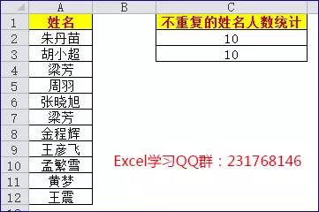 一是利用数组公式:=SUM(1/COUNTIF(A2:A12,A2:A12)),输入完公式后按Ctrl+Shift+Enter键,让它自动加上数组公式符号"{}"。