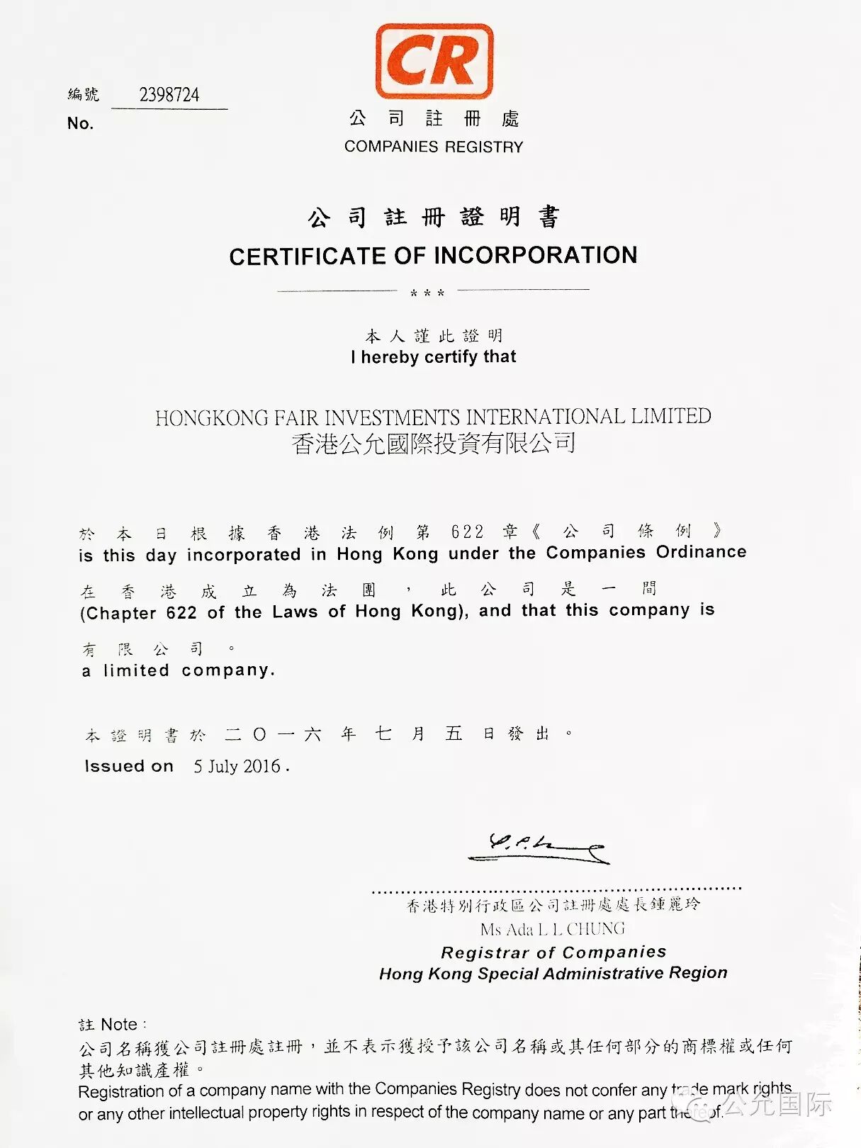 香港公允國際投资有限公司注册资金10亿港币,是由香港、台湾、大陆财团联合组建而成的跨国集团公司(简称:公允集团 ),集团专业为各中小微企业提供资本运营,并购重组,股权设计、股权咨询、战略规划等专业化服务,同时面向亚洲地区进行大健康、大消费、大环保、互联网、物联网行业的战略投资控股集团公司