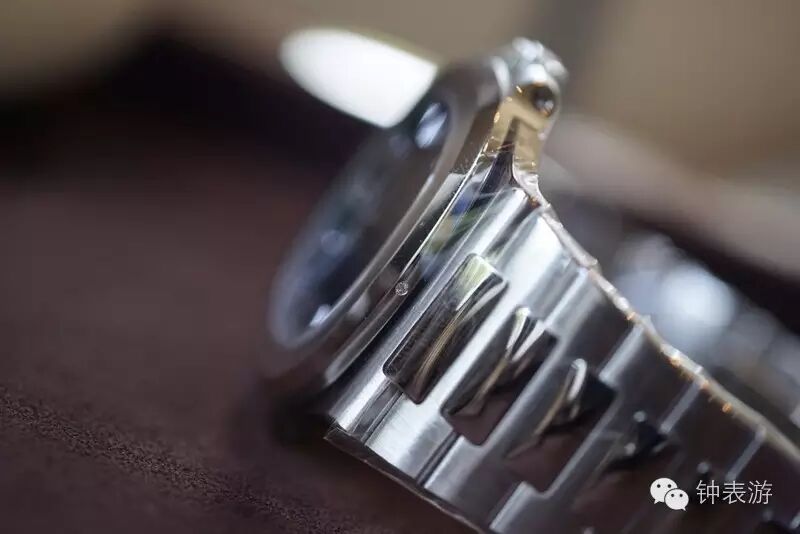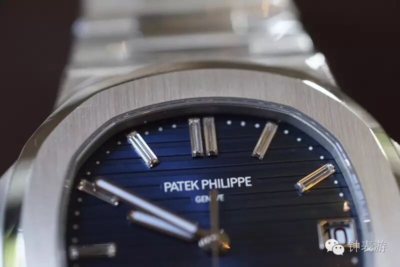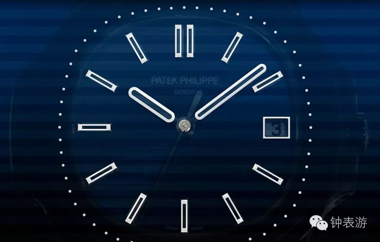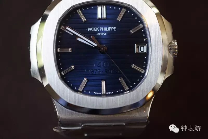 百达翡丽40毫米直径铂金表壳的NautilusRef. 5711/1P。当你从表正面第一眼欣赏它时,表盘上的40周年标识并不是特别的明显和突出。而在不同角度的光照之下,近处看,40周年的字样才会清晰地显示出来