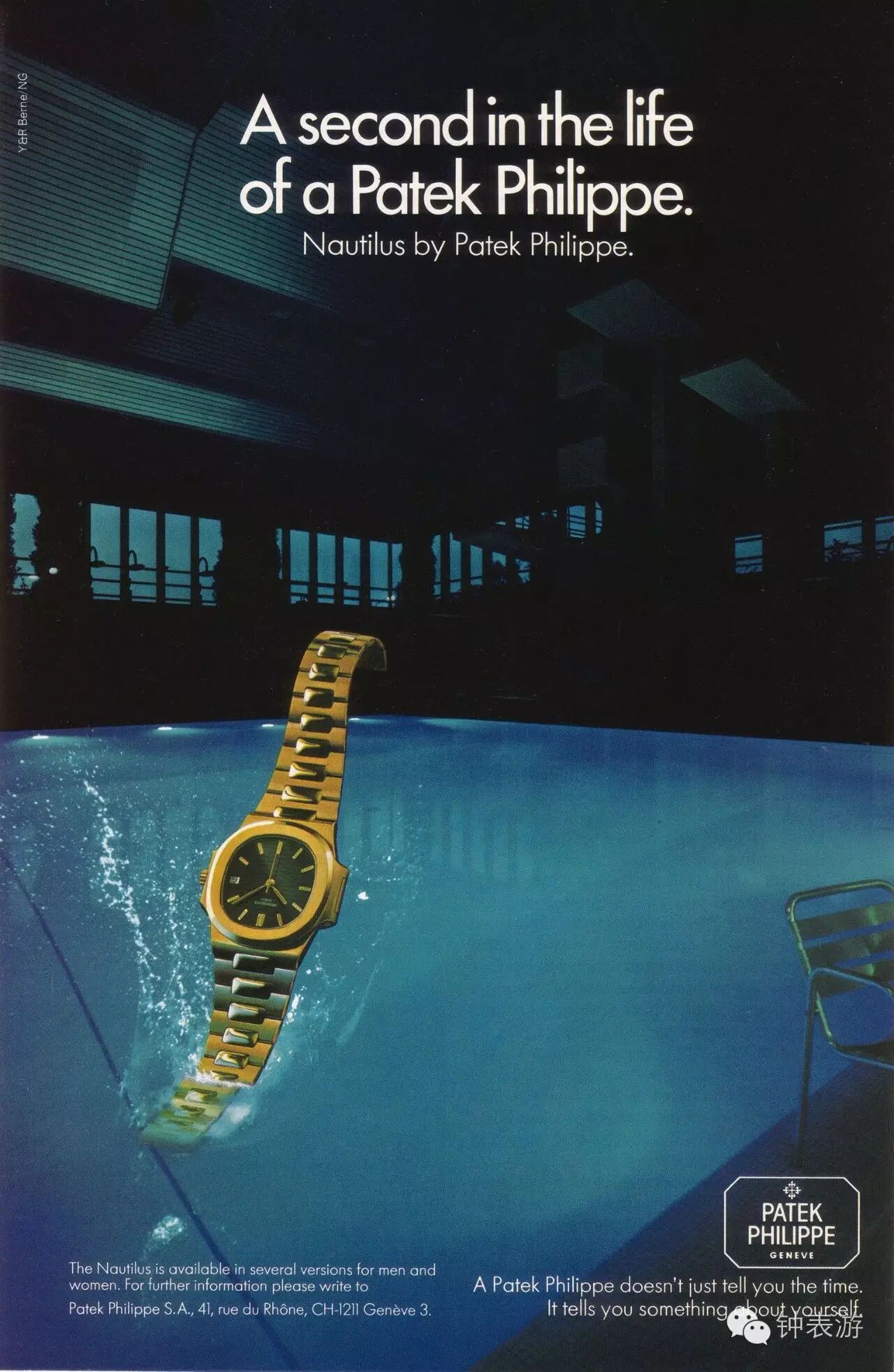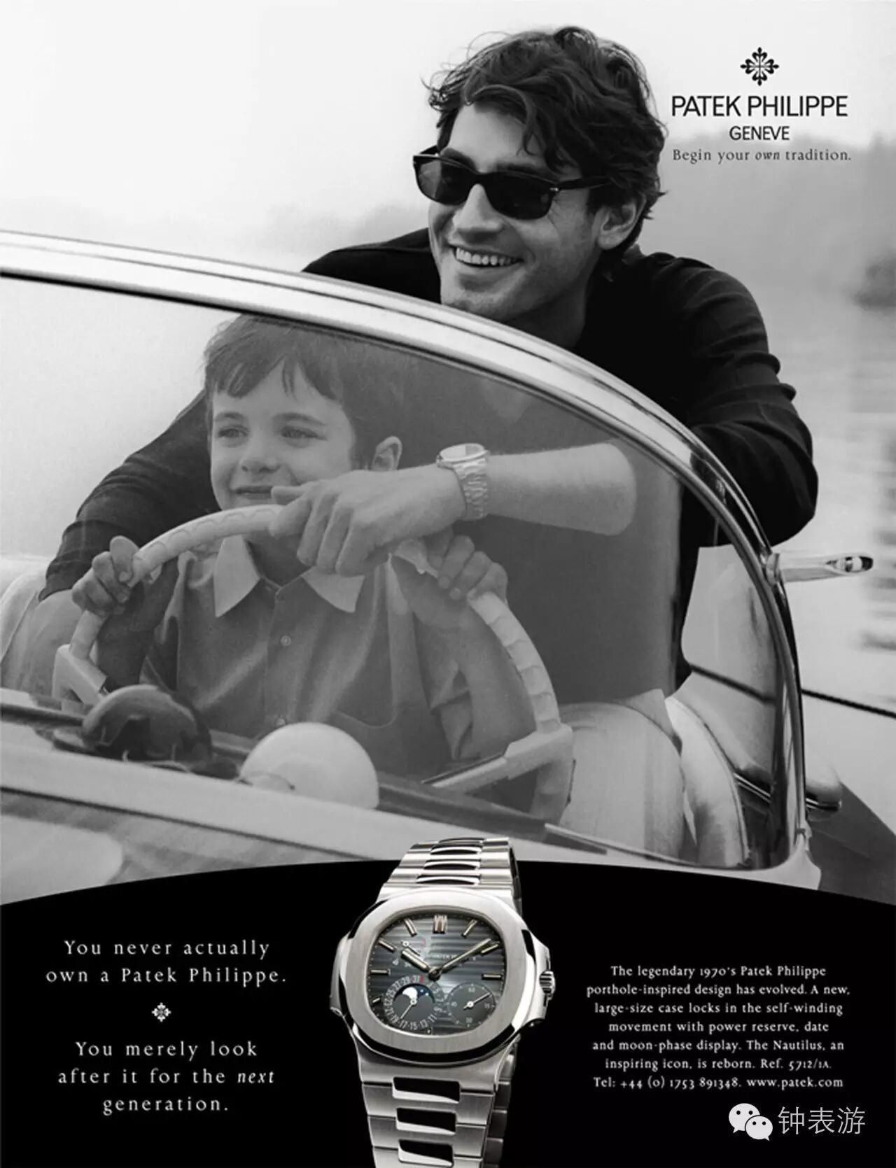 近年的百达翡丽Nautilus广告。百达翡丽“You never actually own a Patek Philippe,You merely look after it for the next generation”(没有人能真正拥有百达翡丽,只能为下一代保管而已)这句广告语深入人心
