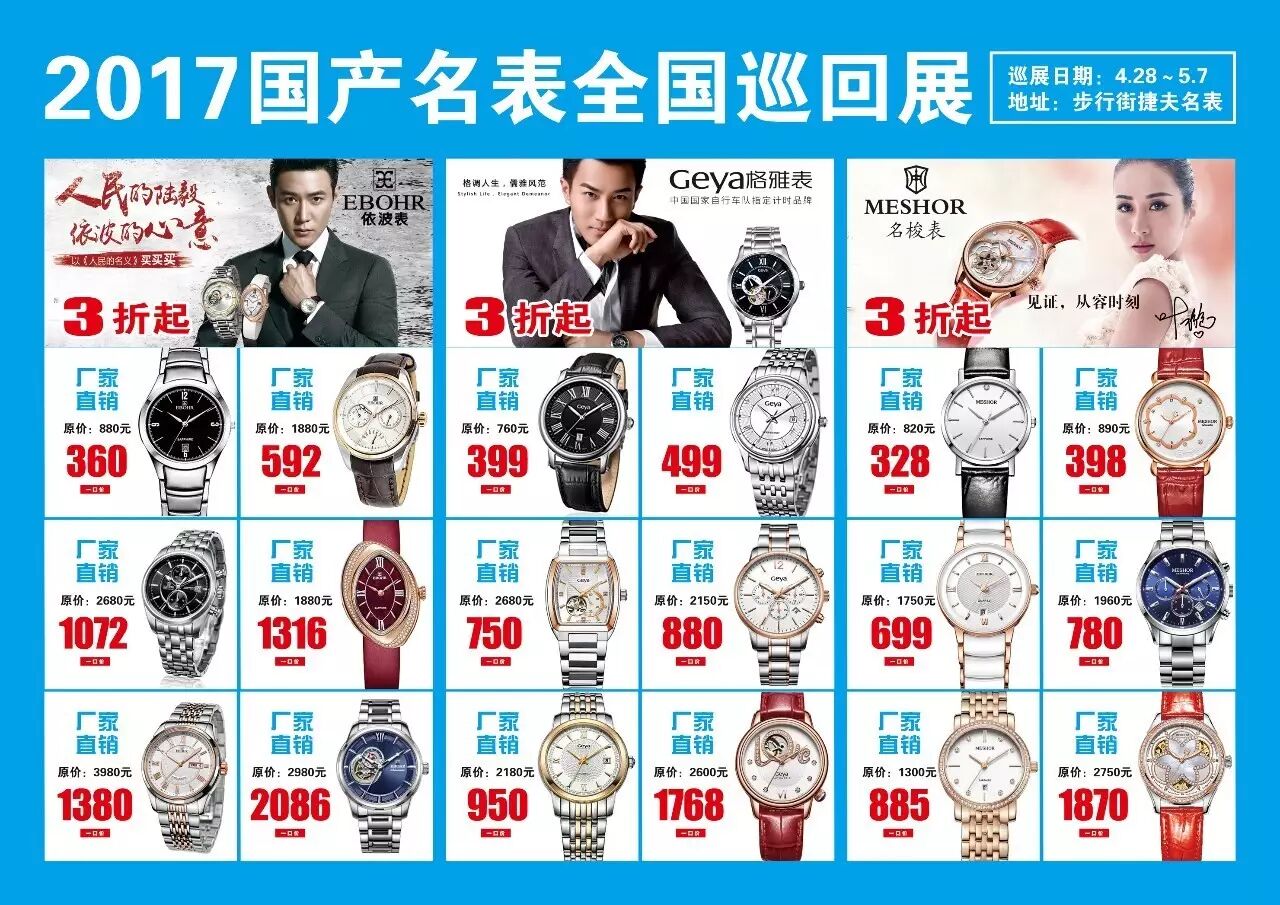 2017国产名表全国巡回展,依波、格雅、名梭、全场3折起,将此活动文字+图片转发朋友圈三天,领取奖品时需群发好友(微信好友100人以上)即可免费领取厨房三件套一份,领取时间为4月28-4月29日,上午9点至11点,(每天限前300名),地址:步行街中段捷夫瑞士名表中心,电话:0464-8661888