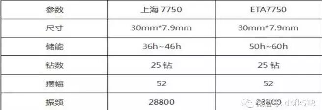 我们先来讲解上海7750,上海7750的竞品有,丹东7750,揭阳7750,他们都是以价格的方式和上海7750竞争。在技术上依然是以模仿上海7750为主,那么为什么上海7750一直以稳定性著称呢?因为上海7750的游丝卷数,厚度,和ETA7750相差无几,但是因为其材质是镍基合金而且宽度偏宽,并非ETA7750自行研发的游丝材质,所以在和ETA7750的比较稳定性和精确性上会更弱一些。可以说ETA7750的精准和稳定,有大部分是靠游丝的专利取胜的,导致有实力的厂家无法复制。以下是上海7750机芯和ETA7750机芯的参数对比: