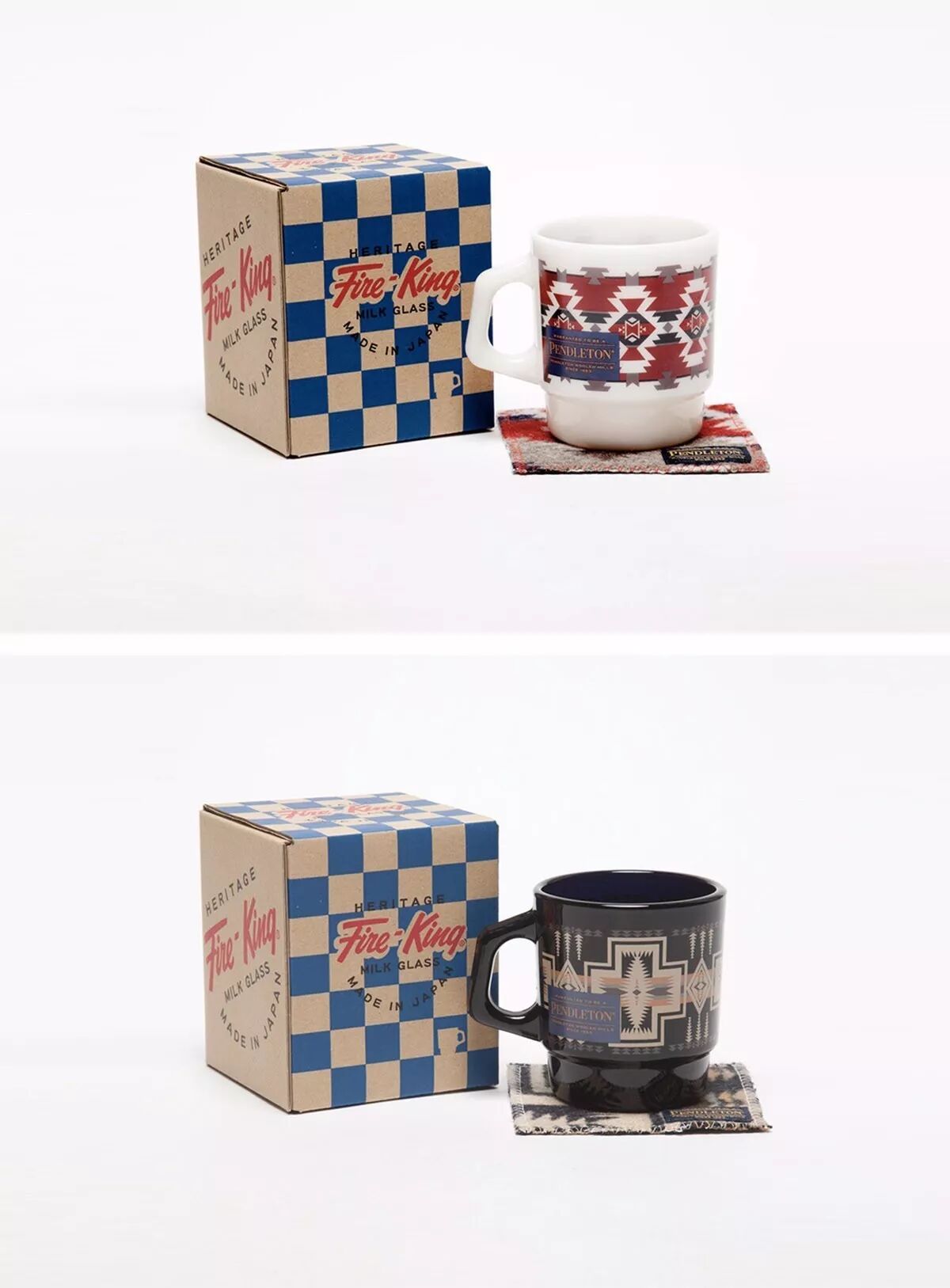 在此次合作中,双方共打造了黑、白两款配色的杯子,并在杯身中融入了 Pendleton 最为招牌式的民族图腾,而每一个杯也会附有相应图案的毛毯杯垫,可以说是相当用心了。