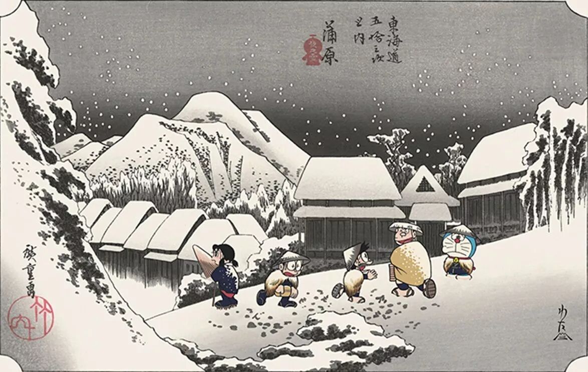 在前段时间,第三波中则是以日本浮世绘大师葛饰北斋最出名的画作“神奈川冲浪里”为蓝本,请来日本政府所认证、继承自江户时代流传至今技术的职人制作,将大雄、静香、小夫等角色融入其中。