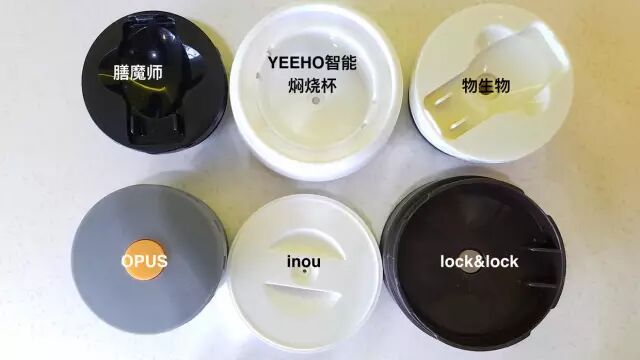 从顶部来看,各有特色,其中最为差异化的就是YEEHO智能焖烧杯和inou,都有一个显示屏和按键,其他的产品作为常规盖子配置,都差不多,但是OPUS的杯子有一个提手确实比较方便