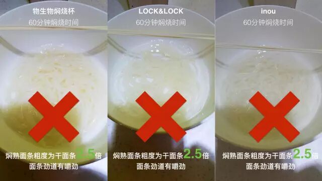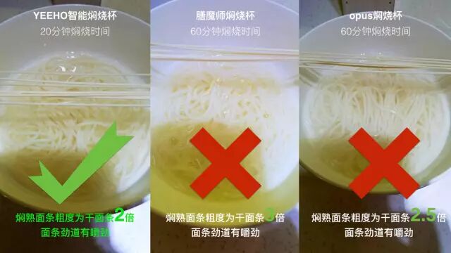 我们会发现一个问题,不同商家对于同样食材的焖烧时间相差较大,同样有顾客反映焖不熟,我们就以其中面条焖烧1小时的设计来看下焖出来的面条效果如何呢?比较面条的闷烧最考究。这里我们分为两组进行对比YEEHO智能焖烧杯和其他焖烧杯,据资料显示,YEEHO智能焖烧杯号称可以通过温度检测与焖烧杯数据进行匹配,自动计算出食材的焖烧时间