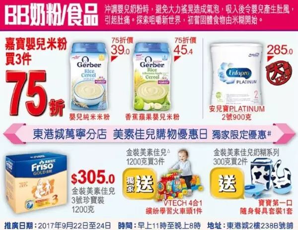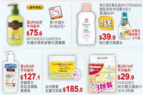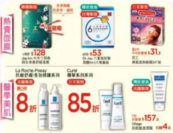 OLAY新生高效精致系列特价HKD 129;花王蒸汽眼膜5片装,买2件平均价HKD 31.3;Curel精华系列85折;全线婴儿食品买3送1;更多优惠详见下文,有效期至2017.09.24。