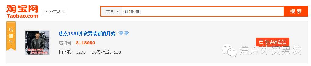淘宝店铺搜索:8118080 或 焦点1981外贸男装新的开始 可以直达店铺!
