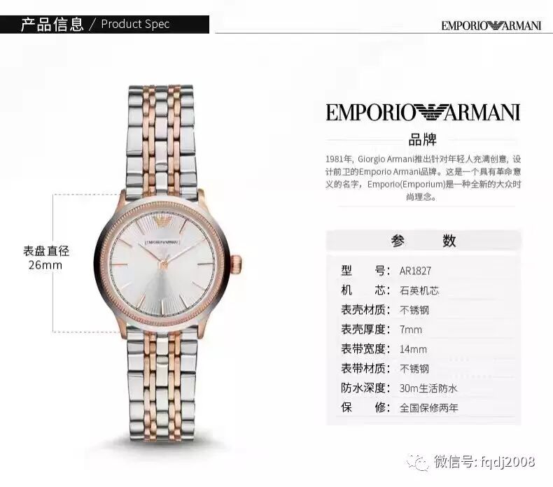 AR1827,女款石英手表,玫瑰金色与银色组合,相得益彰!表盘直径26mm,厚7mm。不锈钢表带,时尚简约单品,推荐各位宝宝们入。正品货源,3年保修,支持专柜验货!顺丰包邮特价890