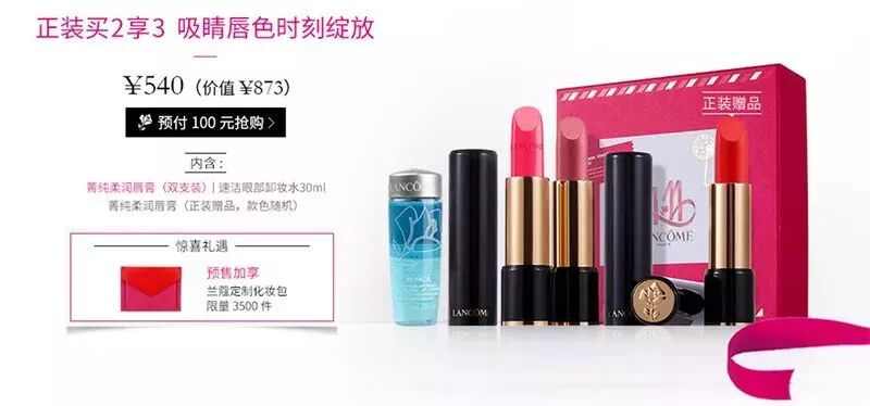 比如,预购兰蔻菁纯柔润唇膏口红双支套装,加赠一支同款唇膏正装(颜色随机)!还赠送眼部卸妆水30ml,并且前3500位再赠送兰蔻定制化妆包。