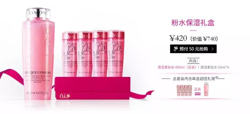 再如,预购兰蔻清滢柔肤水400ml(就是那款有名的粉水),赠品包含4瓶50ml装的清滢柔肤水,相当于一瓶200ml的产品正装,也可以说是超值了。