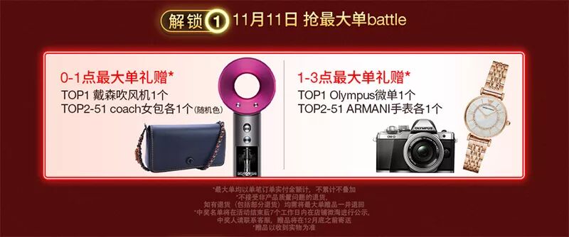 同样,美宝莲在双十一当天设置了不同的时段,在时段内最大单享受壕礼,有戴森吹风机、Olympus微单、coach女包、阿玛尼手表等。