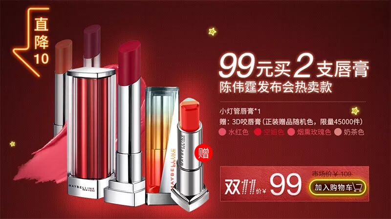 买正装送正装,也是美宝莲过去使用过的套路之一。比如,预购轻垫霜送气垫粉凝霜,预购小灯管唇膏送3D咬唇膏,预购两瓶卸妆液送一瓶卸妆液等。对有相关需求的消费者来说,确实很划算。