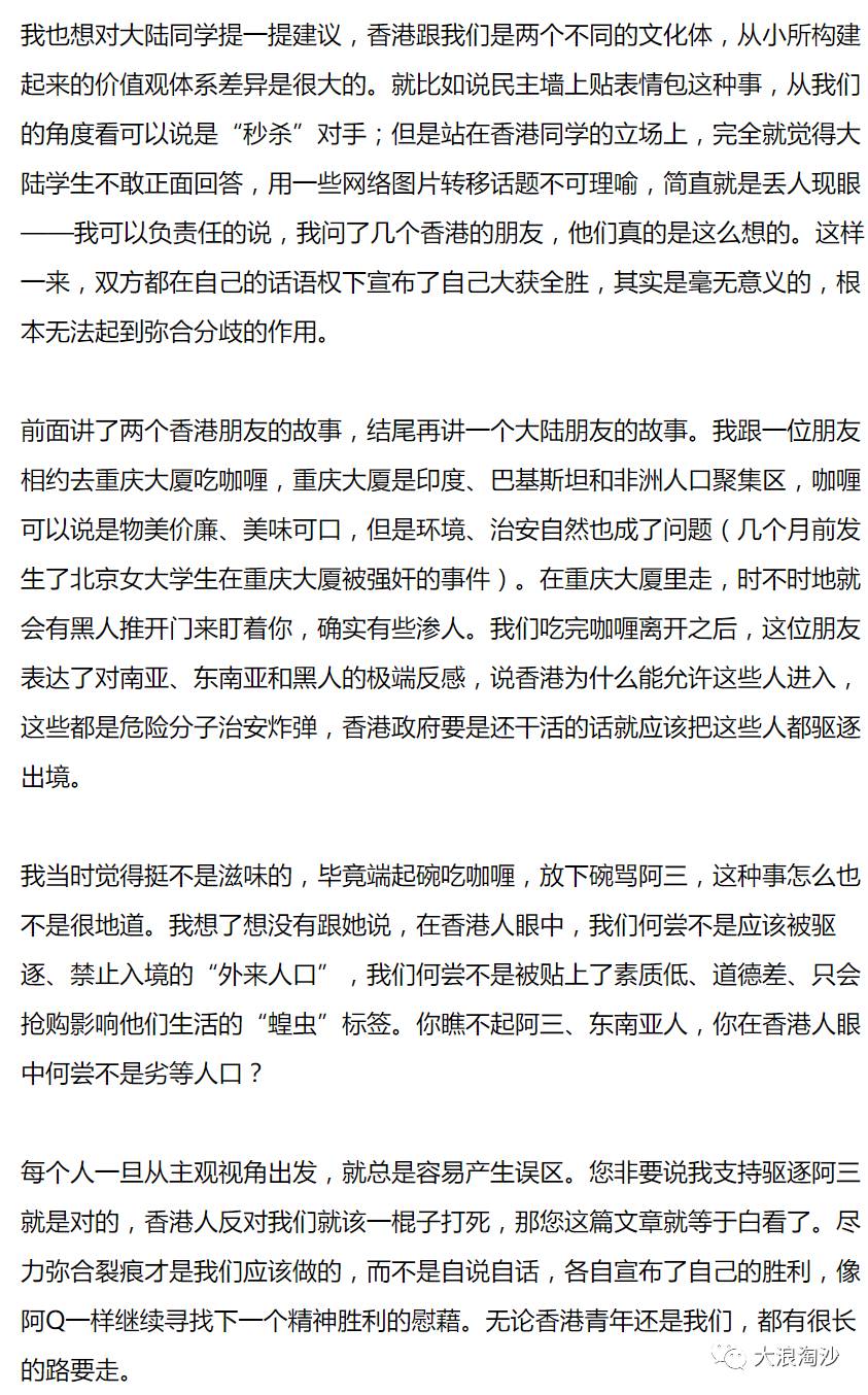 我有一套不成熟的理论,我认为大陆香港青年之间的差距,是人均资源占有量差异导致的(这里的资源不是狭义的自然资源,而是广义的社会资源、经济资源、教育资源等等)。从根本上讲,大陆人口人均资源占有量低,而香港经过了数十年的繁荣,人均资源占有量毫无疑问远大于大陆。也正因为此,香港青年不需要过于拼搏向上、过于努力奋斗,就能获得自己相对满意的资源占有;而对比人口众多、上升渠道狭窄、社会资源并不丰富的大陆,需要的竞争则要激烈和残酷许多。这也是为什么,我会感觉到香港青年中浓浓的“天真”气息,因为整个社会的塑造并不需要他们进化的多么“成熟”。