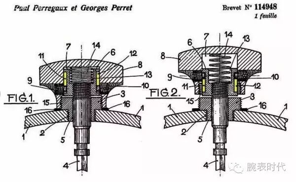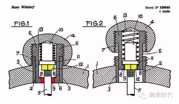 劳力士的创始人汉斯先生洞悉到防水表壳的未来前景,从最初的瑞士发明者手中买下了这项技术并改进了旋入式表冠设计。密封从壳外搬到壳内,同时密封材质选择用铅,经久耐用,防水效果也很理想。上图红色和黄色是实现表冠防水的关键部位,这两个矩形部分在拉出表冠时候都能够紧密贴合,水分很难进入,推入到底部后完全密封,不仅防水效果好,对防水部件的磨损率也大大的降低。螺纹同样加宽加厚,在内部弹簧作用下,旋紧的表冠始终处于紧迫状态,在这一套精密的设计下,别说水了,空气进入都难。1927年,他为其旋入式表冠申请了专利(专利编号CH 120848)。在劳力士改进了表冠设计的情况下,劳力士经典的耗式表壳也孕育而生。蚝式是指劳力士发明的一体化成型表壳、旋进式底盖和旋进式把头的设计,即Oyster,表镜与表底都采用螺纹锁紧的方式加强密封。