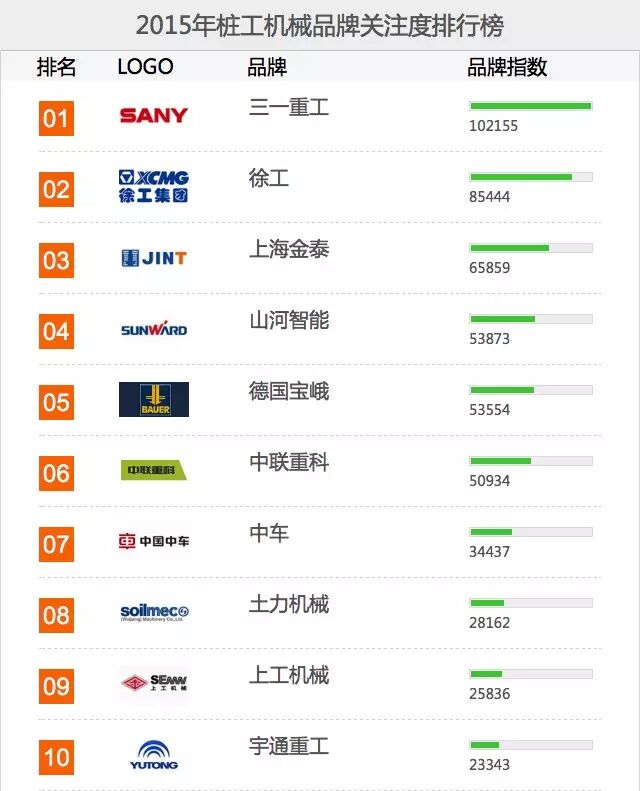 2016年1月12日,中国路面机械网和工程机械电商网在北京发布了《2015中国工程机械用户品牌关注度排行榜》。这是继2009年中国路面机械网首次推出用户品牌关注度排行榜以来,连续第八年推出该榜单。此次中国路面机械网和工程机械电商网不仅发布了中国工程机械用户品牌关注度总榜单,同时还推出了囊括路面机械、土方机械、混凝土机械、起重机械、桩工机械、工业车辆等六大系列,涵盖沥青摊铺机、压实机械、养护机械、挖掘机、装载机、混凝土搅拌站、搅拌运输车、。2015年桩工机械品牌关注度排行榜榜单