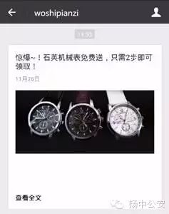 近日,小编忽然收到一条短信:“尊敬的会员,加微信公众号woshipianzi即可领取198元石英机芯精美手表一块,男女通用,大家都在领,先到先得……”